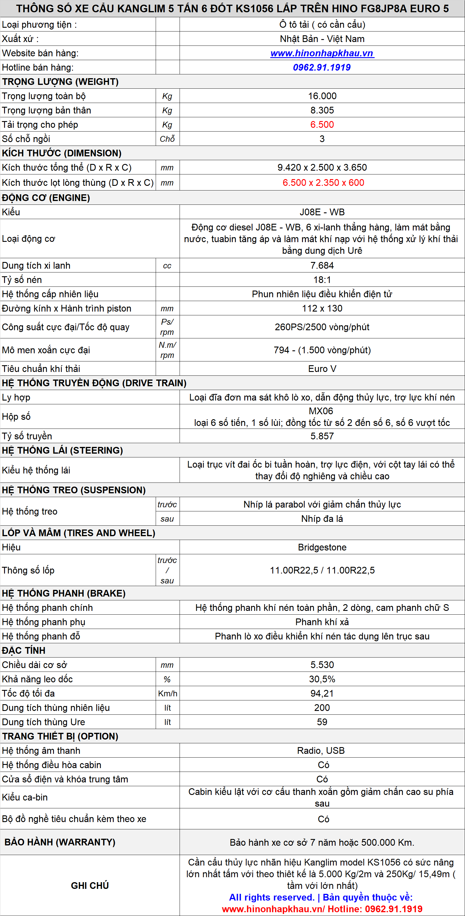 * THÔNG SỐ KỸ THUẬT XE TẢI CẨU HINO FG8JP8A-PGV GẮN CẨU KANGLIM 5 TẤN 6 KHÚC KS1056 MỚI NHẤT: