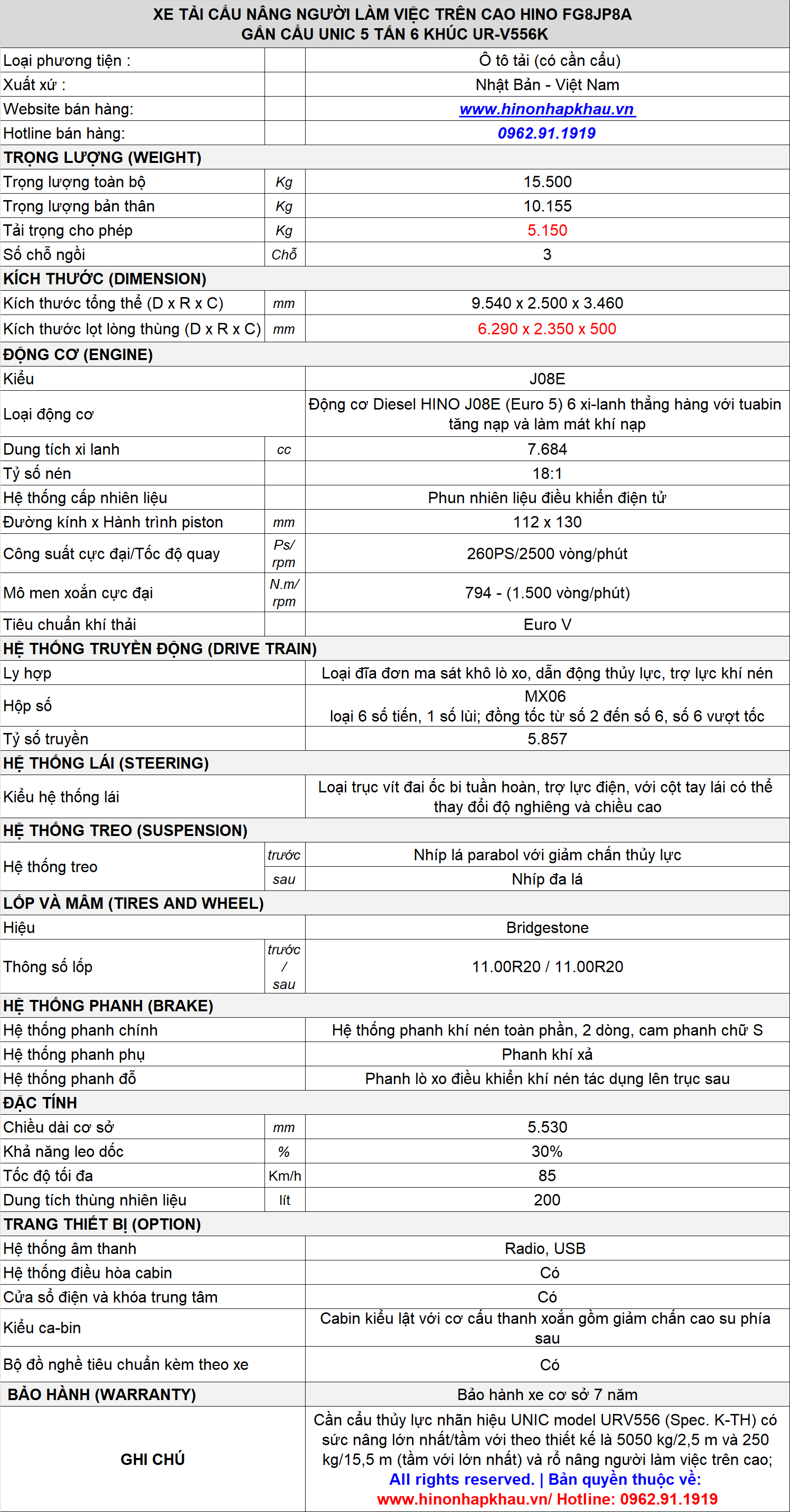 * THÔNG SỐ ĐẶC TÍNH KỸ THUẬT XE CẨU NÂNG NGƯỜI LÀM VIỆC TRÊN CAO HINO 9 TẤN FG8JP8A GẮN UNIC UR-V556K:
