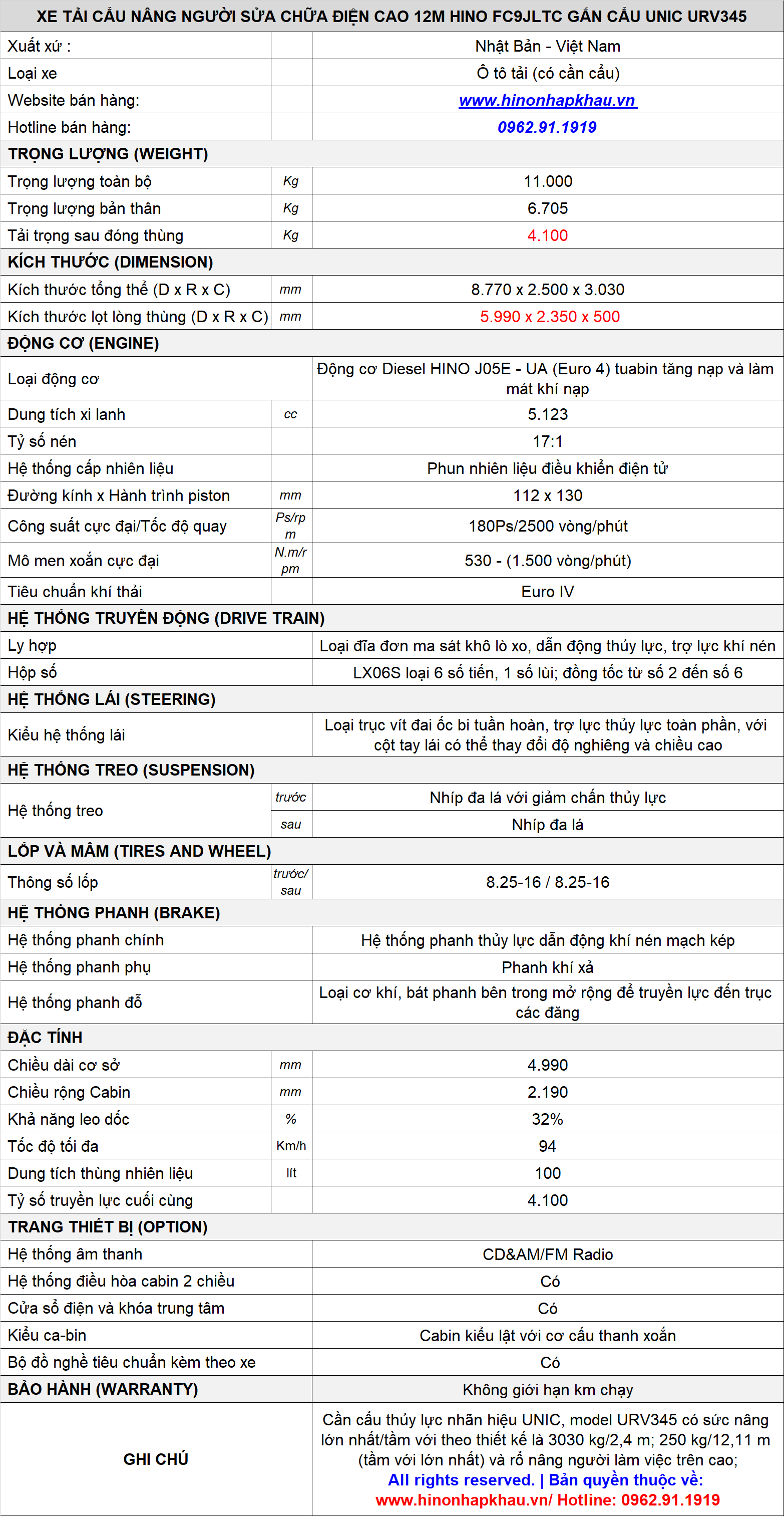 * THÔNG SỐ KỸ THUẬT XE CẨU NÂNG NGƯỜI SỬA CHỮA ĐIỆN TRÊN CAO 12,11M HINO 500 FC9JL7A GẮN CẨU UNIC URV345 PHIÊN BẢN 2025 - 2026 MỚI NHẤT: