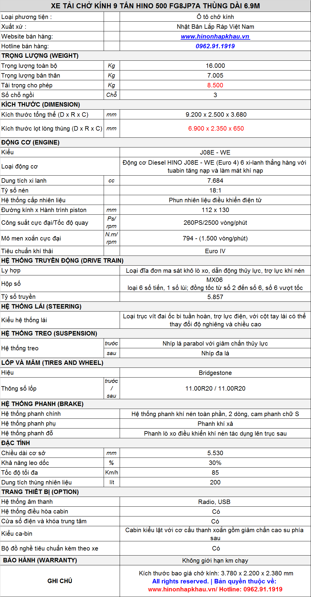 * THÔNG SỐ KỸ THUẬT XE TẢI THÙNG LỬNG CHỞ KÍNH 9 TẤN HINO 500 FG8JP7A EURO 4:
