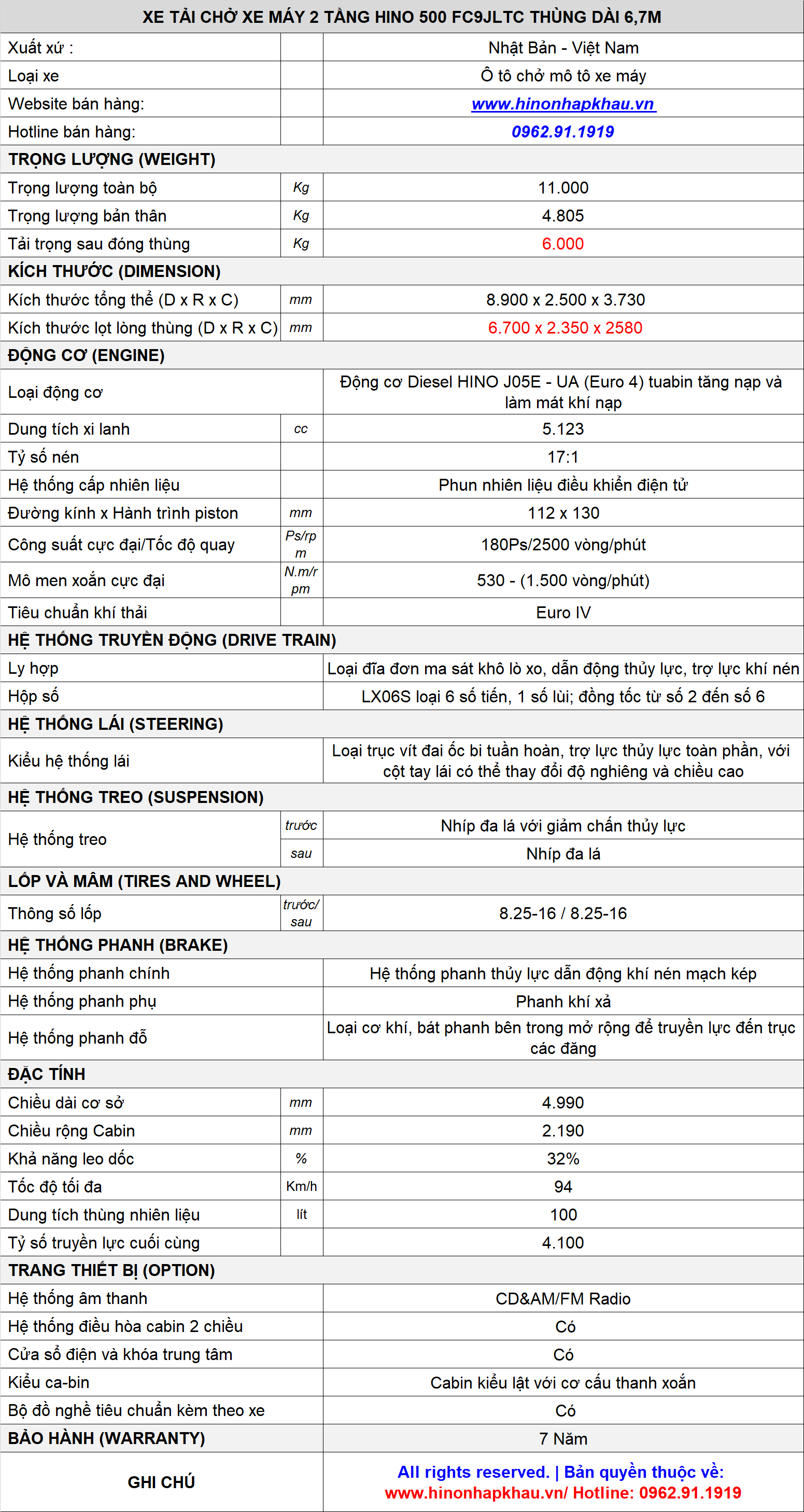 * THÔNG SỐ KỸ THUÂT XE CHUYÊN DỤNG CHỞ XE MÁY MUI BẠT 2 TẦNG HINO 500 FC9JL7A EURO 5: