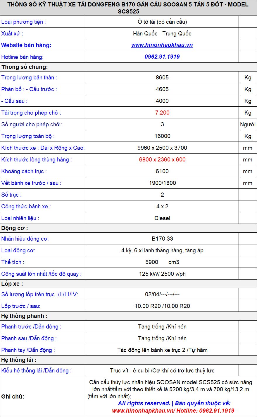 Xe tải Dongfeng 9 tấn B170 gắn cẩu SOOSAN 5 tấn 5 đốt - Model SCS525 :