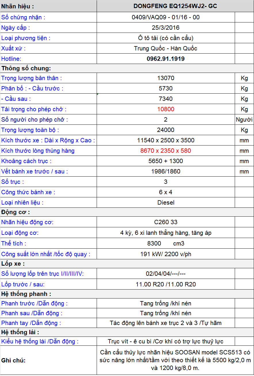 * Thông số kỹ thuật xe Dongfeng 3 chân lắp cẩu 5,5 tấn Soosan SCS513: