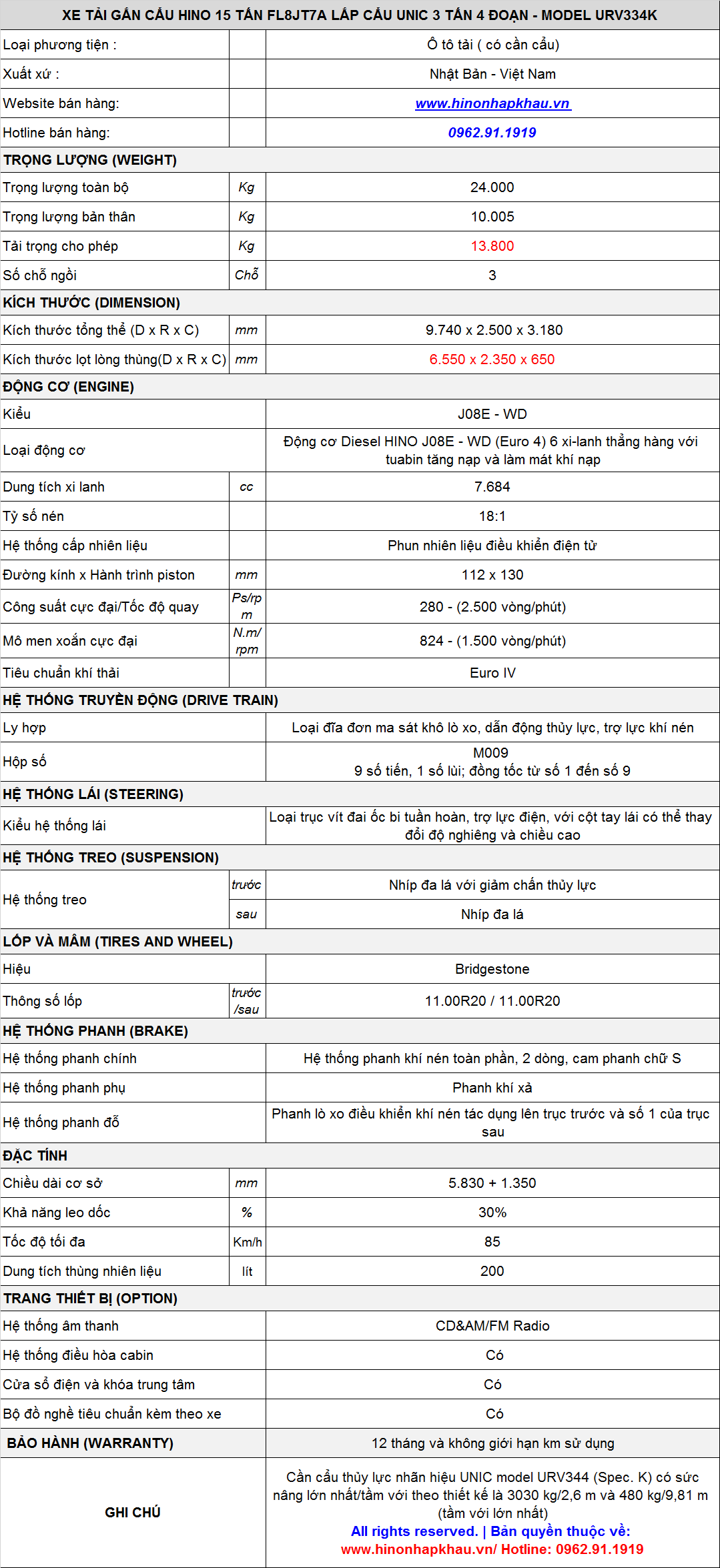 * THÔNG SỐ KỸ THUẬT XE TẢI GẮN CẨU HINO 3 CHÂN FL8JT7A LẮP CẨU UNIC 3 TẤN 4 ĐOẠN URV344K :