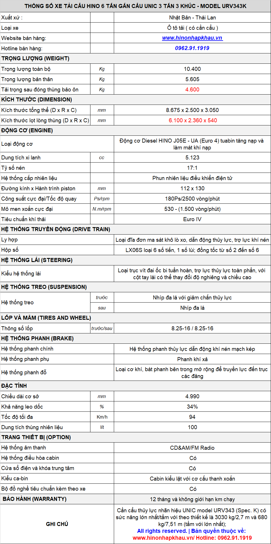 - Xuất xứ cẩu: UNIC URV343K nhập khẩu từ nhà máy UNIC Thái Lan. Chất lượng mới 100%.