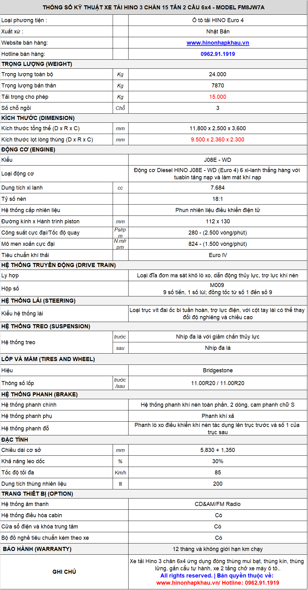 - Trọng lượng toàn bộ 24000 Kg, cùng trang bị lốp Bridgestone cỡ 11.00R20 chất lượng cao, cùng điều hòa 2 chiều chính vẫn được giữ nguyên ở phiên bản xe Hino FM dài 2 cầu 6x4 mới này.