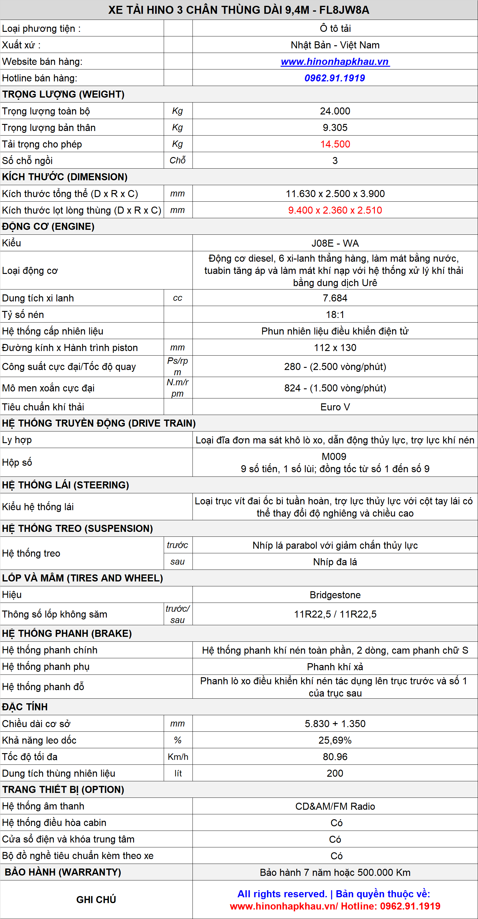 GIỚI THIỆU VÀ THÔNG SỐ KỸ THUẬT XE TẢI HINO 15 TẤN 3 CHÂN 6x2 THÙNG DÀI 9M4 - Model FL8JW8A EURO 5: là dòng xe tải được sản xuất và lắp ráp trên dây truyền công nghệ hàng đầu của Toyota Nhật Bản.