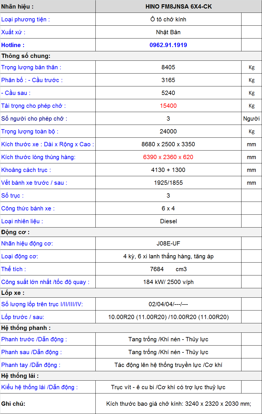 * Thông số kỹ thuật xe Hino 3 chân chở kính: