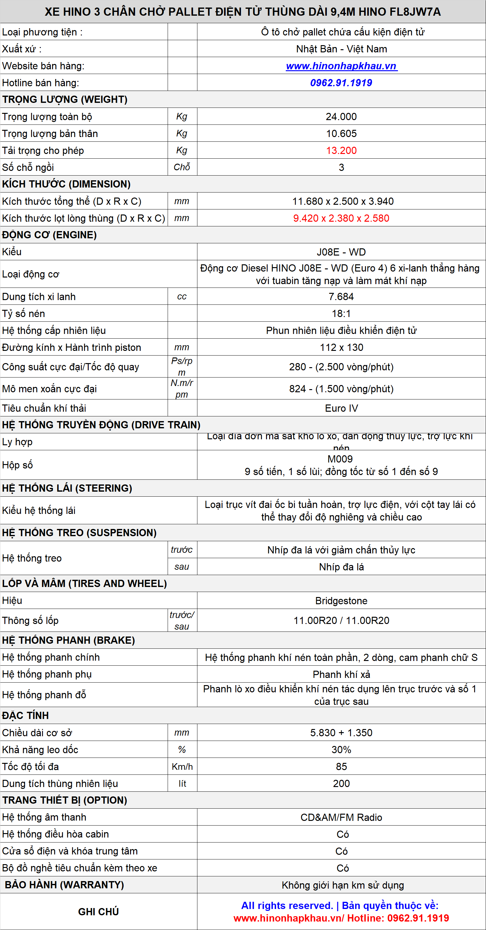 * THÔNG SỐ KỸ THUẬT XE TẢI HINO 15 TẤN FL8JW7A CHỞ PALLET CHỨA CẤU KIỆN ĐIỆN TỬ ĐỜI 2021 - 2022: