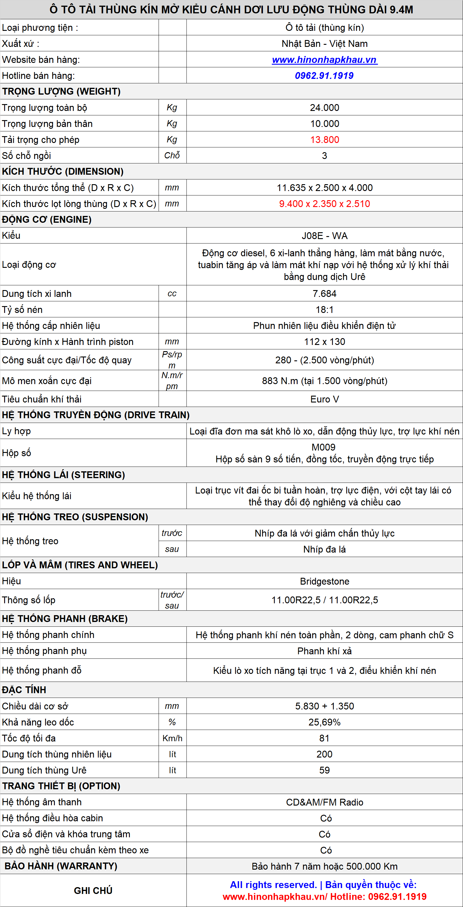 * THÔNG SỐ, ĐẶC TÍNH KỸ THUẬT XE TẢI CÁNH DƠI LƯU ĐỘNG 15 TẤN HINO 3 CHÂN FL8JW8A EURO 5 MỚI: