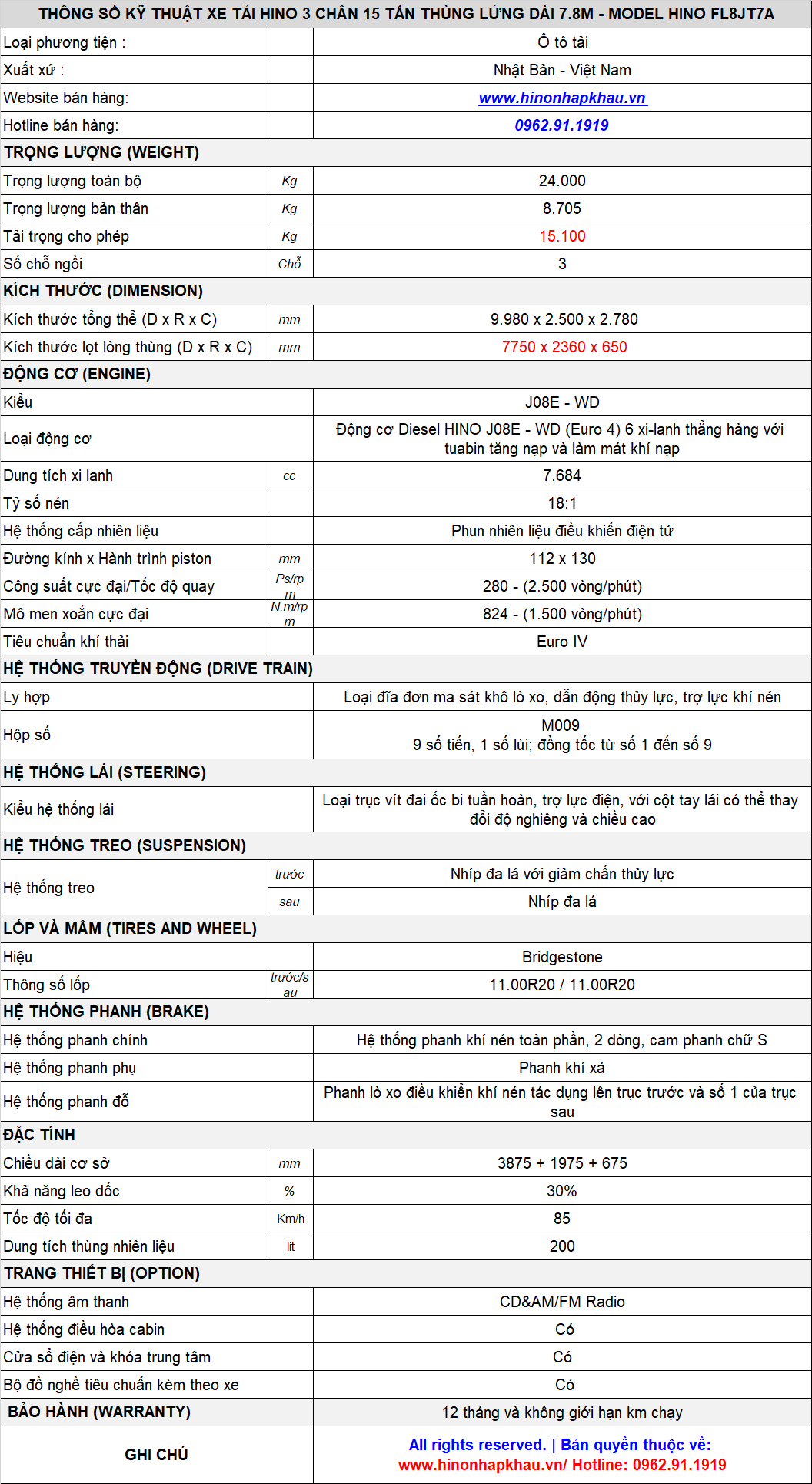 - Sản phẩm xe tải 3 chân 15 tấn EURO 5 thùng lửng với linh kiện nhập khẩu 3 cục từ nhà máy Hino Motors Nhật Bản lắp ráp tại nhà máy Hino Motors Việt Nam.