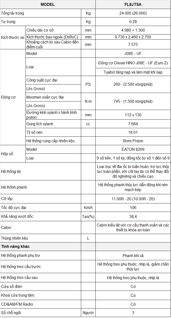 * Thông số kỹ thuật xe tải Hino 16 tấn 3 chân FL8JTSA: