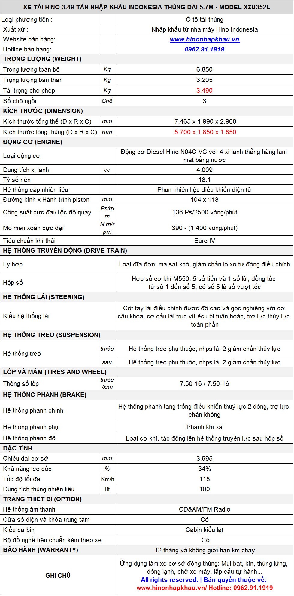 Với thương hiệu và chất lượng đã được khẳng định trên thị trường Việt Nam cũng như trên toàn thế giới, cùng với dịch vụ chăm sóc hậu mãi sau bán hàng, dịch vụ bảo dưỡng, chăm sóc uy tín chất lượng cao. Xe tải HINO 3.49 tấn nhập khẩu luôn luôn là " Sự lựa chọn hoàn hảo " cho tất cả mọi Khách hàng.