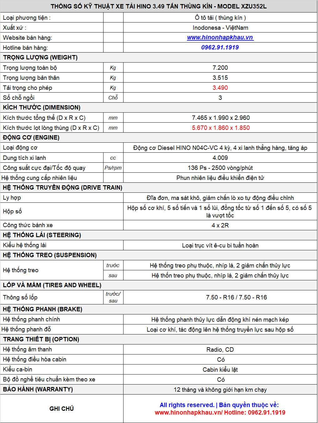 Với thương hiệu và chất lượng đã được khẳng định trên thị trường Việt Nam cũng như trên toàn thế giới, cùng với dịch vụ chăm sóc hậu mãi sau bán hàng, dịch vụ bảo dưỡng, chăm sóc uy tín chất lượng cao. ''Xe tải HINO 3.49 tấn thùng kín'' luôn luôn là " Sự lựa chọn hoàn hảo " cho tất cả mọi Khách hàng.