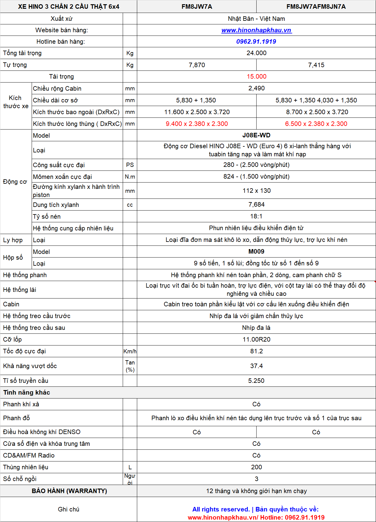 - Hino 3 chân 2 cầu 6x4 tải 15 tấn thùng dài 9,4m - Model FM8JW8A == > Tại đây