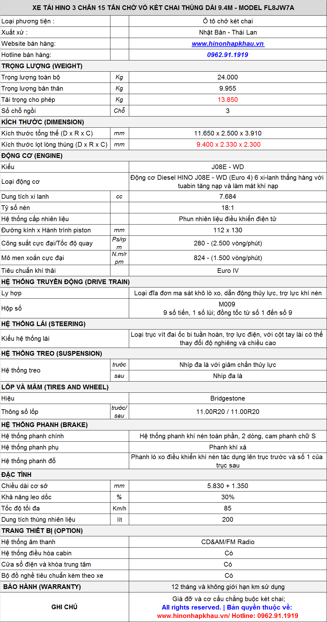* THÔNG SỐ KỸ THUẬT XE TẢI CHUYÊN DỤNG 15 TẤN HINO FL8JW7A CHỞ VỎ KÉT CHAI BIA NƯỚC NGỌT :