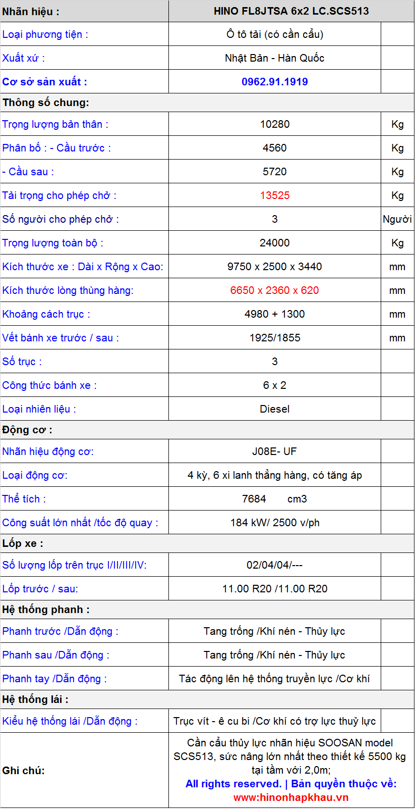 * Dòng sản phẩm HINO 500 SERIES – HINO 3 CHÂN FL8JTSA GẮN CẨU SCS513 được bảo hành chính hãng 12 tháng không giới hạn số km sử dụng và được ưu đãi 7 lần bảo dưỡng miễn phí: thay dầu, thay lọc, nhớt, công... tại tất cả các đại lý ủy quyền của Hino Motors trên toàn quốc.