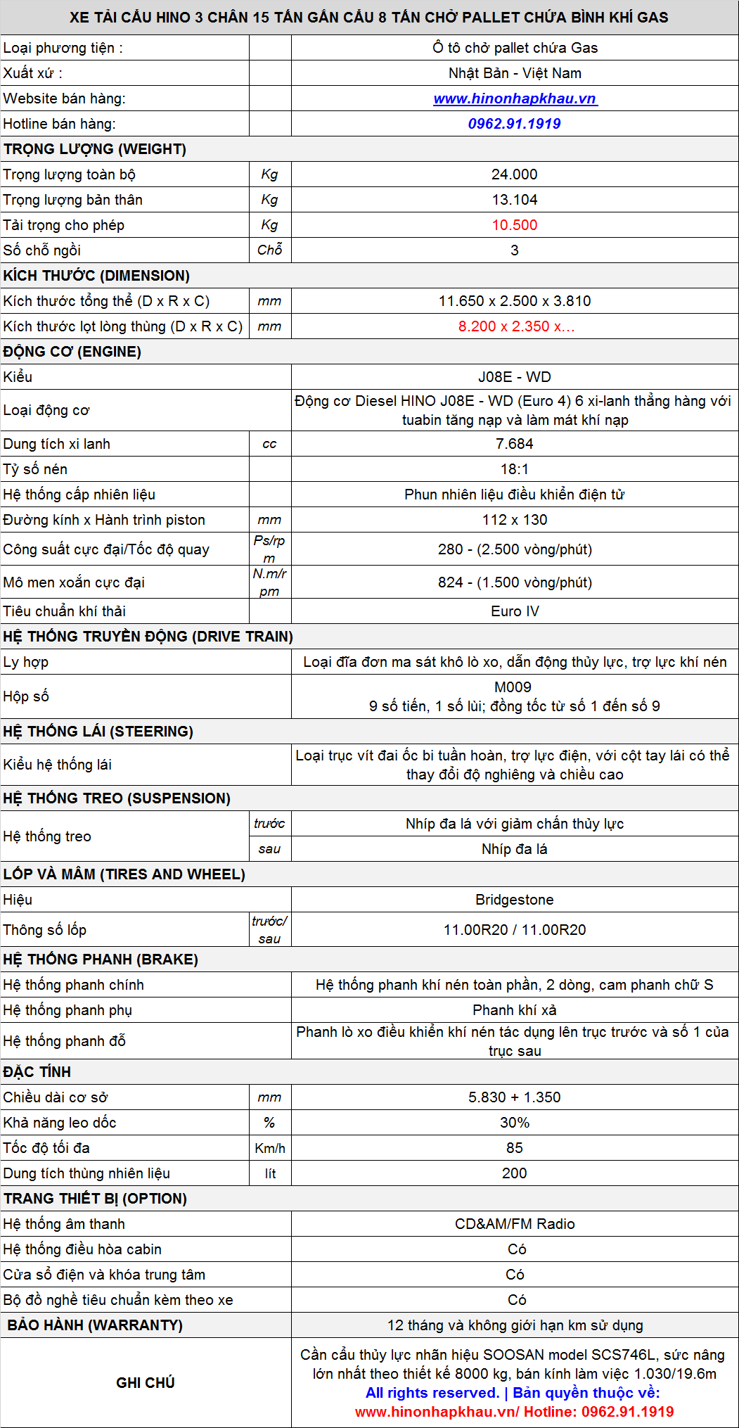 - Xuất xứ: Xe cơ sở với linh kiện nhập khẩu 3 cục từ nhà máy Hino Motors Nhật Bản, lắp ráp tại nhà máy Hino Motors Việt Nam. Sàn Pallet chở bình gas sảu xuất tại Việt Nam