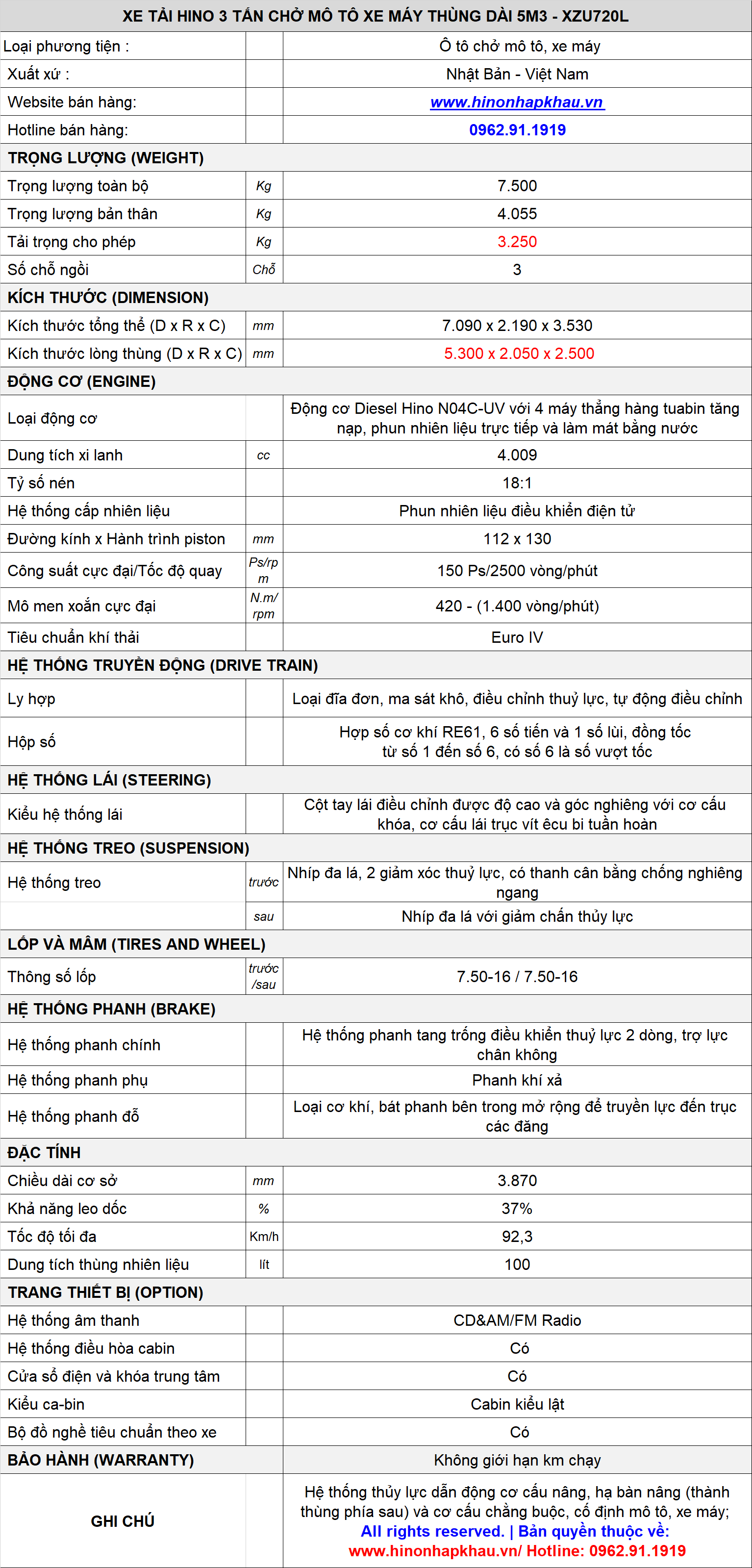 - Xuất xứ: Xe chở xe máy 3 tấn Model XZU720L-WKFRP3 là sản phẩm thế hệ mới nhất tiêu chuẩn khí thải Euro 5 được nhập khẩu 3 cục từ nhà máy Hino Motors Nhật Bản, lắp ráp tại nhà máy Hino Motors Việt Nam. Hệ thống chuyên dùng chở xe máy sản xuất tại Việt Nam