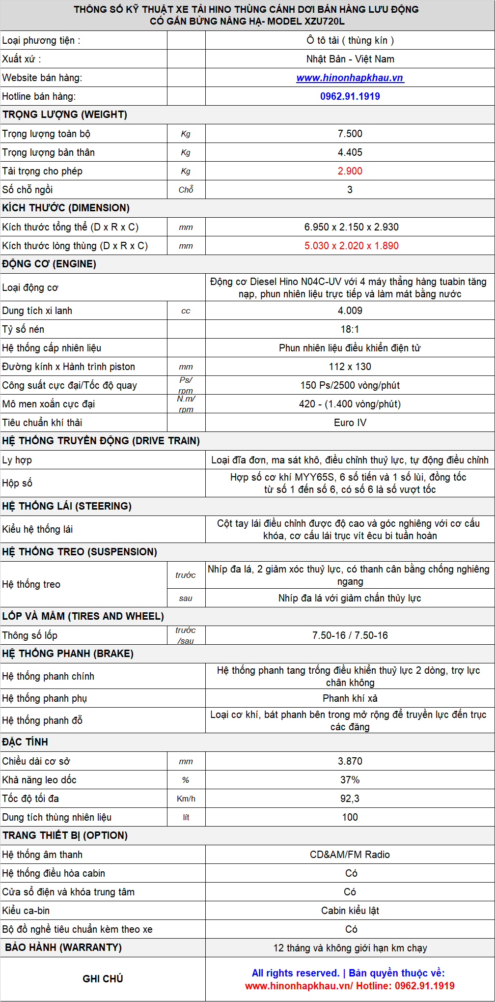 * THÔNG SỐ KỸ THUẬT XE CÁNH DƠI BỬNG NÂNG 3 TẤN HINO XZU720L ĐỜI NĂM 2026 - 2027: