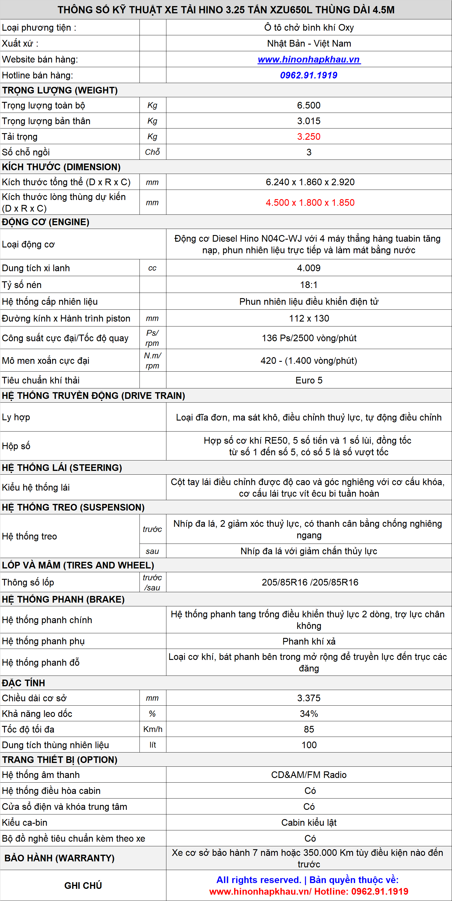 THÔNG SỐ KỸ THUẬT XE TẢI HINO 3 TẤN XZU650L ĐỜI 2025 - 2026 MỚI NHẤT: