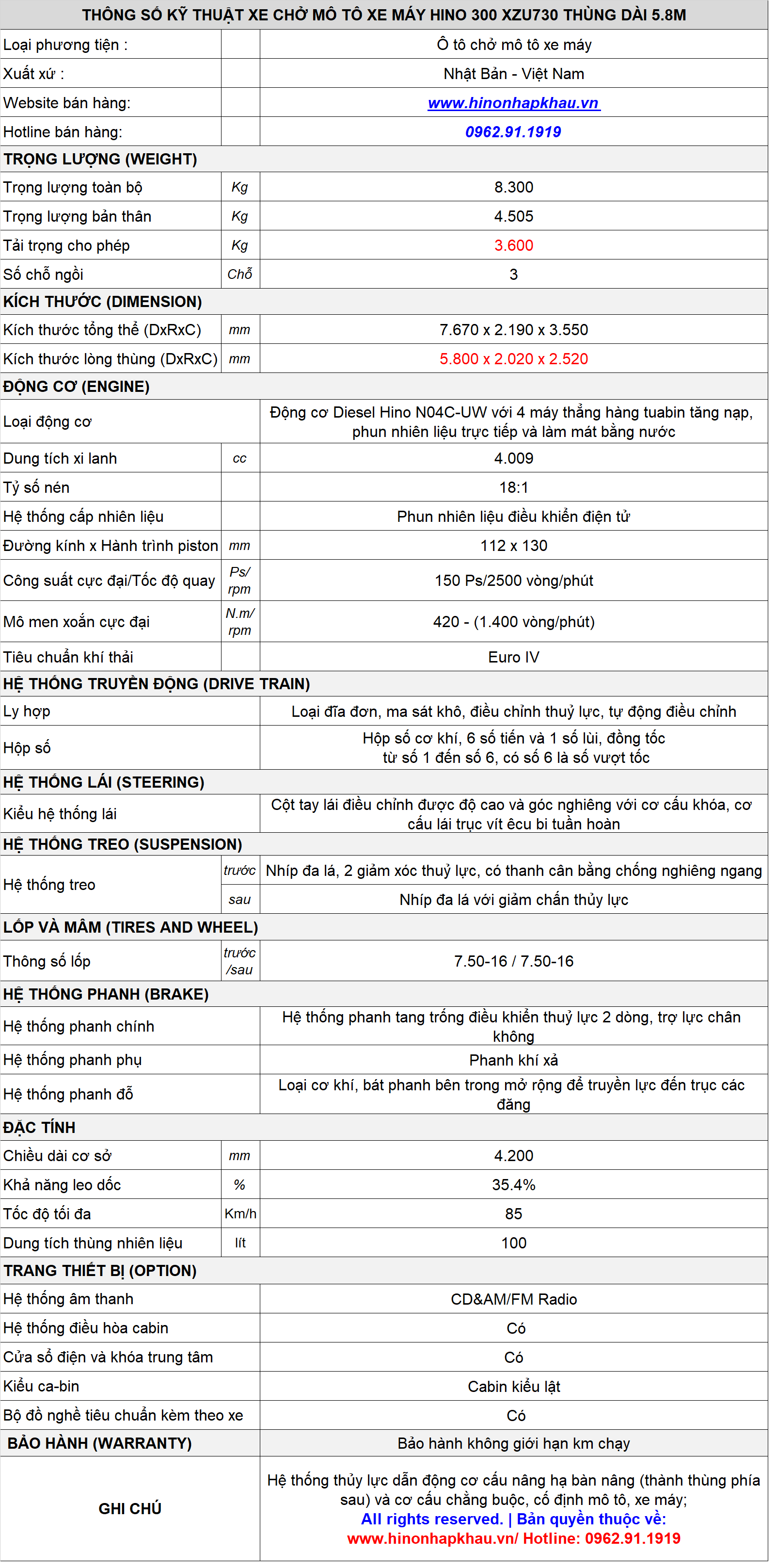 * THÔNG SỐ, ĐẶC TÍNH KỸ THUẬT XE TẢI HINO 300 CHỞ MÔ TÔ XE MÁY XZU730L THÙNG DÀI 5.8M: