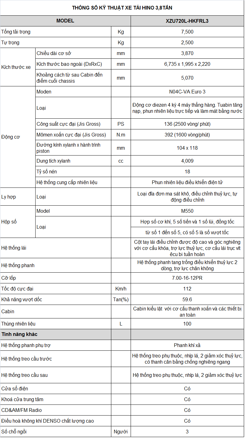 Xe tải Hino Series 300 Model XZU720L 5,2 Tấn Thùng dài 5m được thiết kế chất lượng cao cả về hình dáng bên ngoài lẫn nội thất bên trong với một loạt các tính năng ưu việt: phong cách giản dị nhưng đầy ấn tượng độ bền cao, cabin thoáng và rộng, tiện ích trong sử dụng.