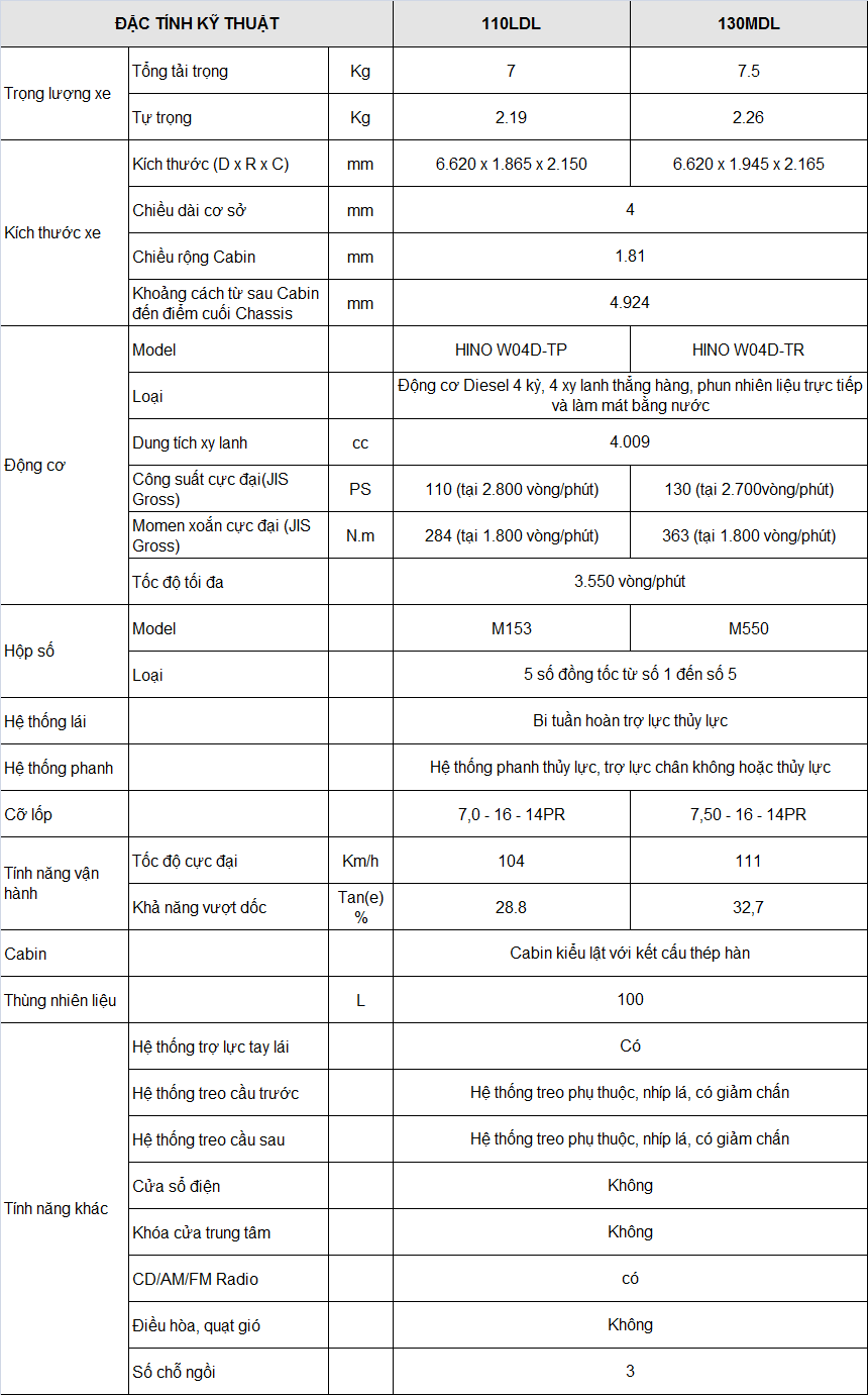 * Thông số kỹ thuật xe tải Hino Dutro 4 tấn WU352L:
