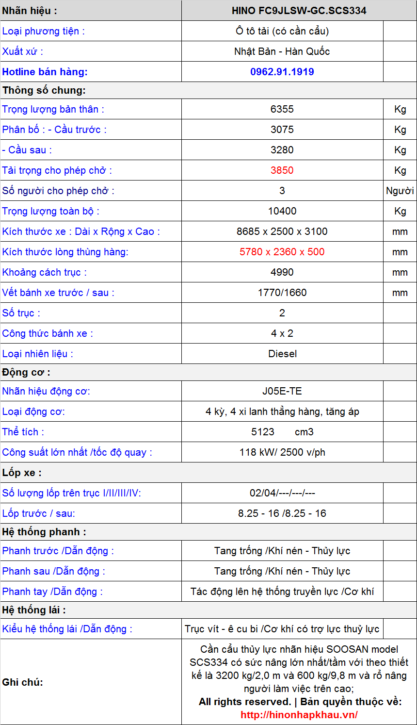 + Xe cơ sở Hino FC9JL7A EURO V thuộc phân khúc tải trung của Hino Motors. Còn cẩu Soosan SCS334 được nhập khẩu nguyên chiếc từ tập đoàn Soosan Hàn Quốc, với công nghệ mới nhất: cẩu được điều khiển toàn bộ bằng thủy lực ra, vào, xuống chân...