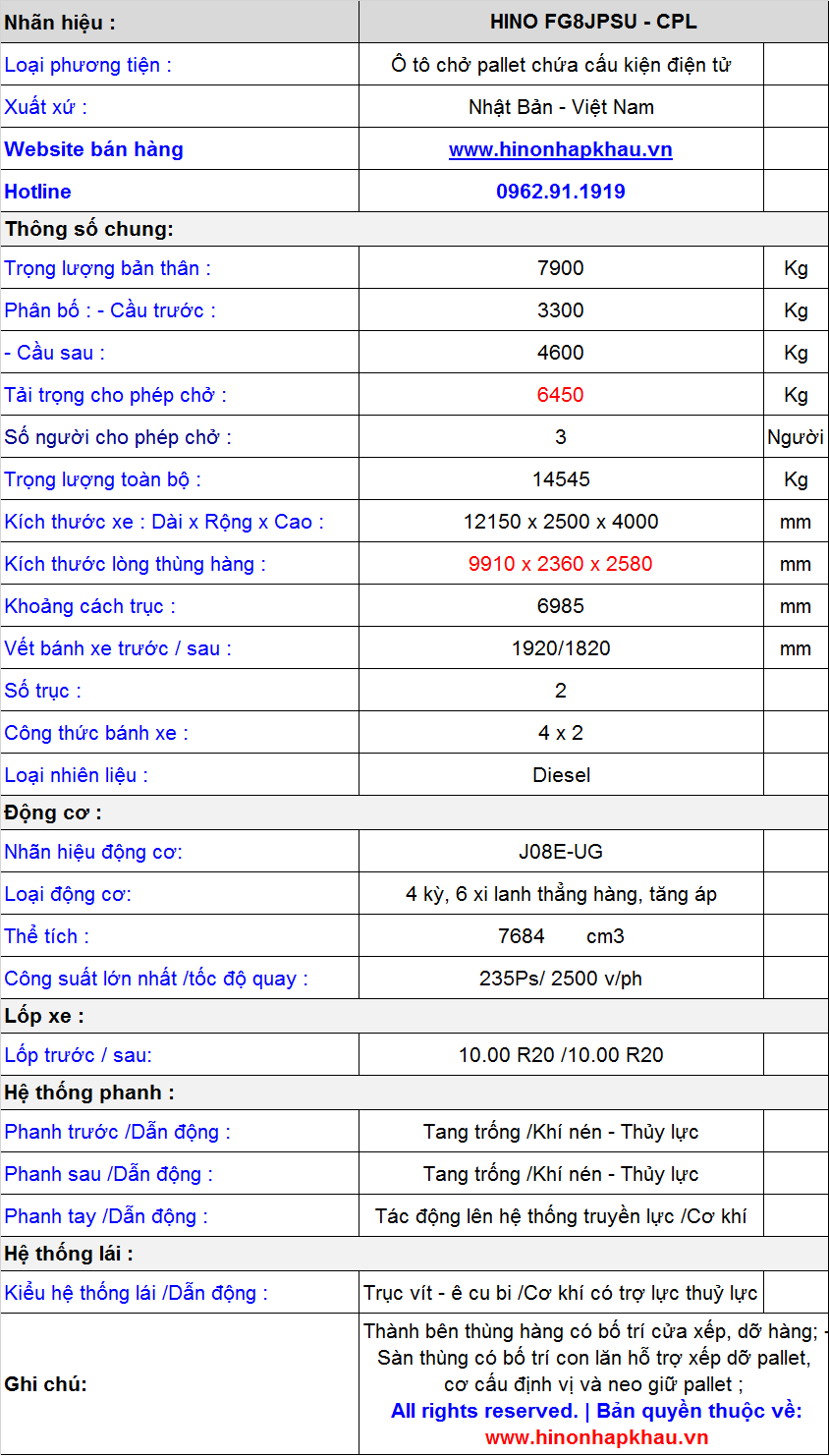 * THÔNG SỐ KỸ THUÂT XE CHỞ PALLET SIÊU DÀI 9,9M HINO 500 SEREIS FG8JTSU- UTL:
