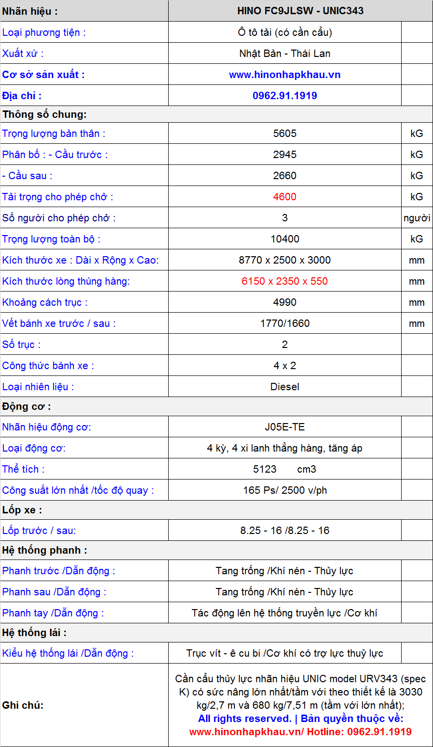 * Thông số kỹ thuật xe tải Hino FC9JLSW gắn cẩu UNIC 3 tấn URV343K:
