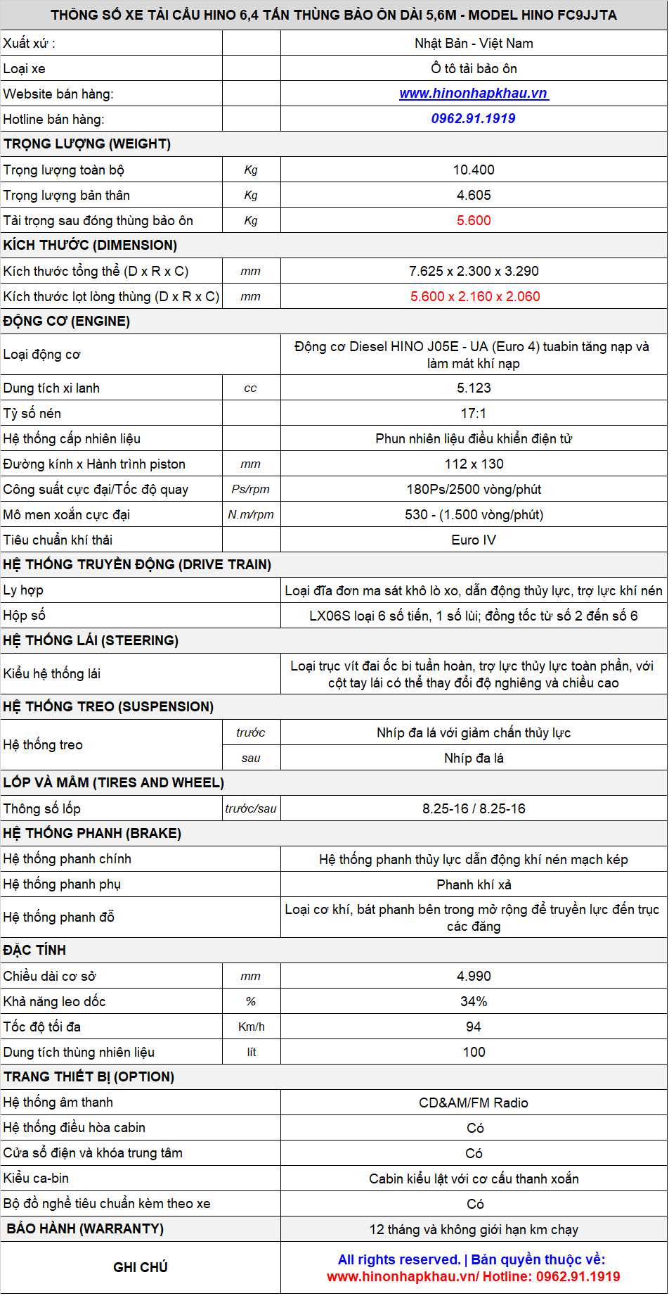 Với thương hiệu và chất lượng đã được khẳng định trên thị trường Việt Nam cũng như trên toàn thế giới, cùng với dịch vụ chăm sóc hậu mãi sau bán hàng, dịch vụ bảo dưỡng, chăm sóc uy tín chất lượng cao. Xe tải HINO 6.4 tấn bảo ôn luôn luôn là " Sự lựa chọn hoàn hảo " cho tất cả mọi Khách hàng.