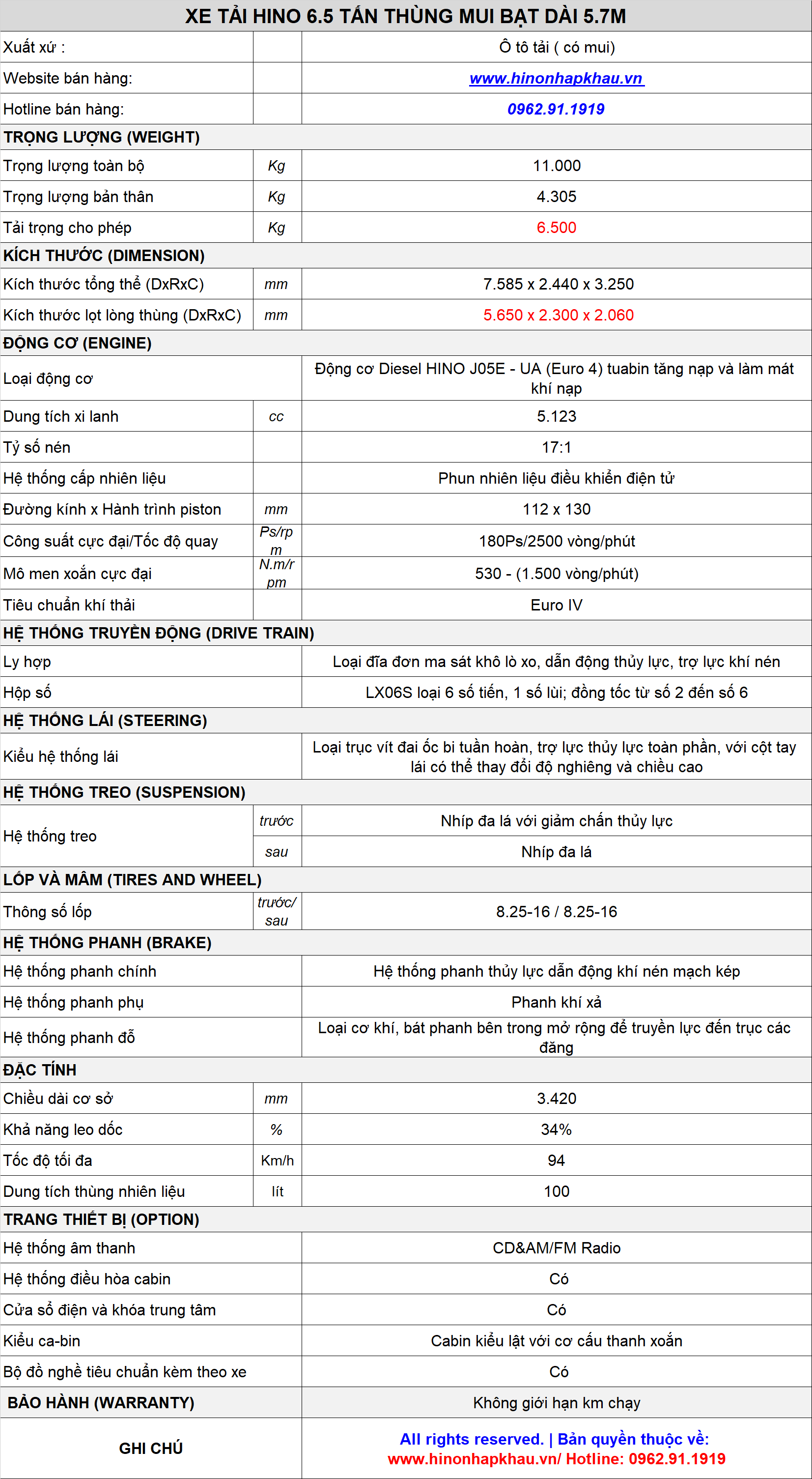 * THÔNG SỐ KỸ THUẬT XE TẢI HINO 6T5 THÙNG MUI BẠT INOX, NHÔM, TÔN KẼM: