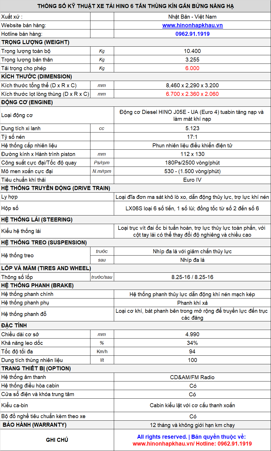 - Là dòng xe tải hạng trung thuộc Series xe tải 500 của Hino được sản xuất trên dây chuyền công nghệ hiện đại, linh kiện đồng bộ nhập khẩu trực tiếp từ nhà máy Hino Motors Nhật Bản – trực thuộc tập đoàn Toyota Nhật Bản danh tiếng thế giới. Xe tải Hino thùng kín gắn bửng nâng hạ 6 tấn được trang bị động cơ Diesel Hino J05E-UA mới nhất với dung tích 5123 cm3 với công suất đạt 180Ps/2500rpm và mô men xoắn đạt: 530N.m/1500rpm giúp xe hoạt động mạnh mẽ, bền bỉ và tiết kiệm nhiên liệu trên mọi cung đường.