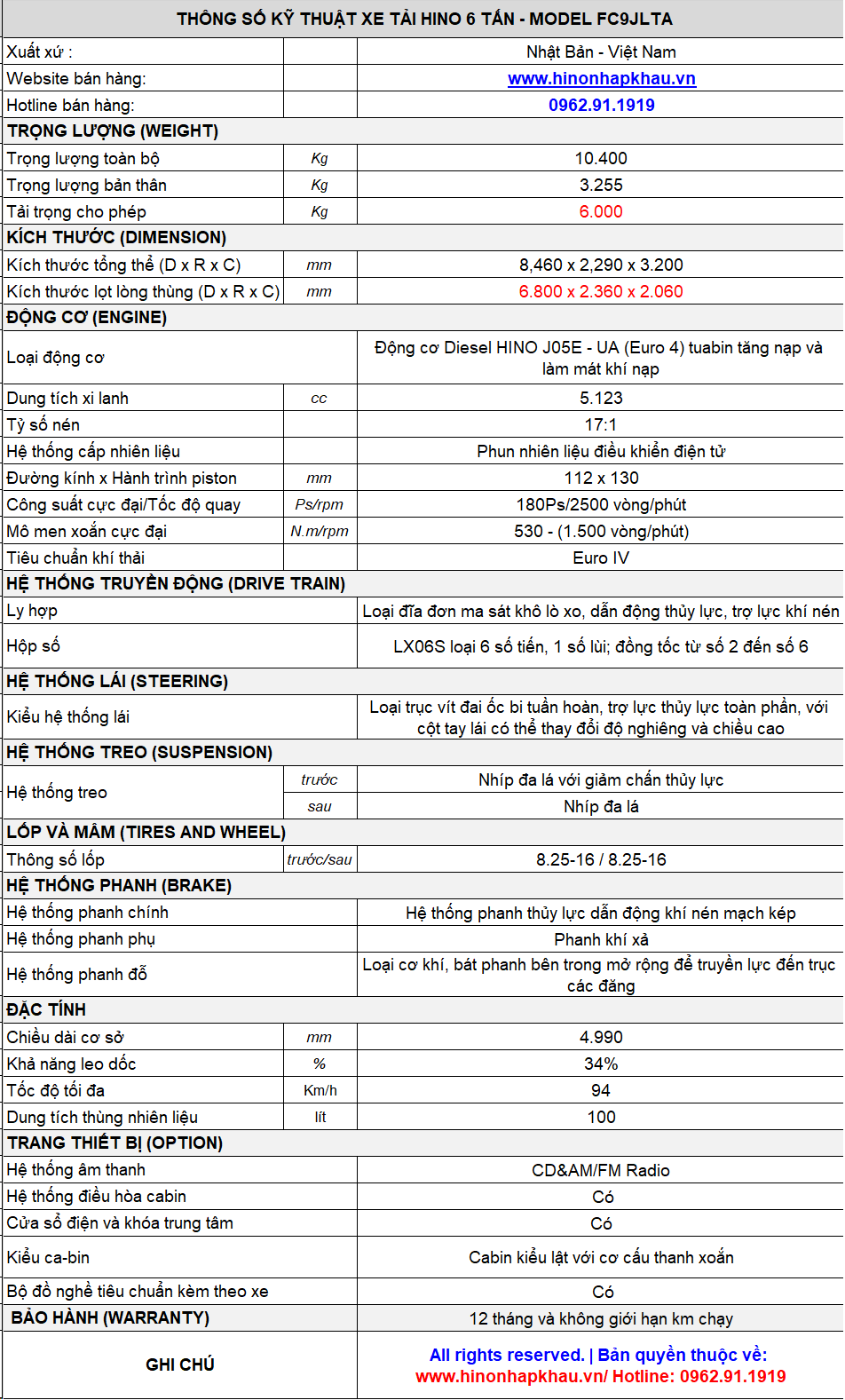 - Xe tải hino 6 tấn thùng mui bạt model FC9JLTC Euro 4 với xe cơ sở được sản xuất và lắp ráp tại Nhà máy Hino Motors Việt Nam với linh kiện CKD (Completely Knocked Down ) với 98% nhập khẩu trực tiếp từu nhà máy Hino Motors Nhật Bản, còn lại chỉ có 2 % liên doanh Việt Nhật đó là lốp xe Yokohama và bình ắc quy GS.