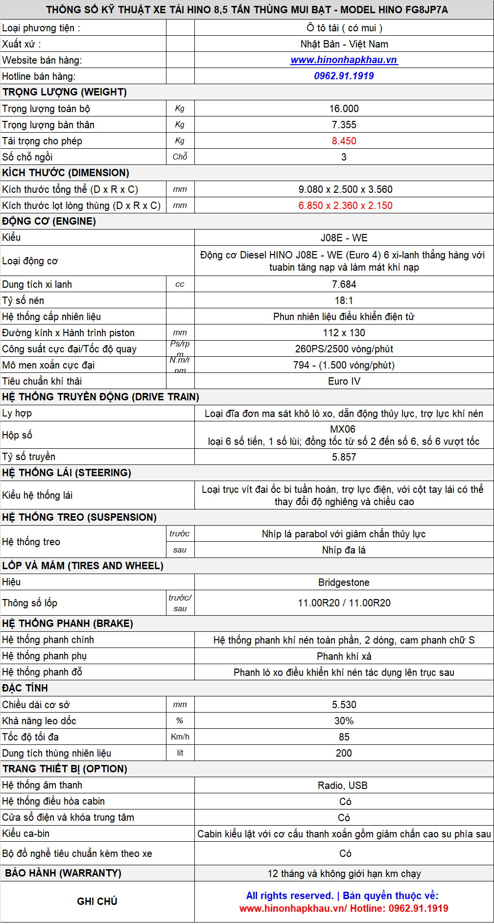 * THÔNG SỐ KỸ THUẬT Ô TÔ TẢI ( CÓ MUI ) 8.5 TẤN HINO FG8JP7A ĐỜI NĂM 2023 -2024:
