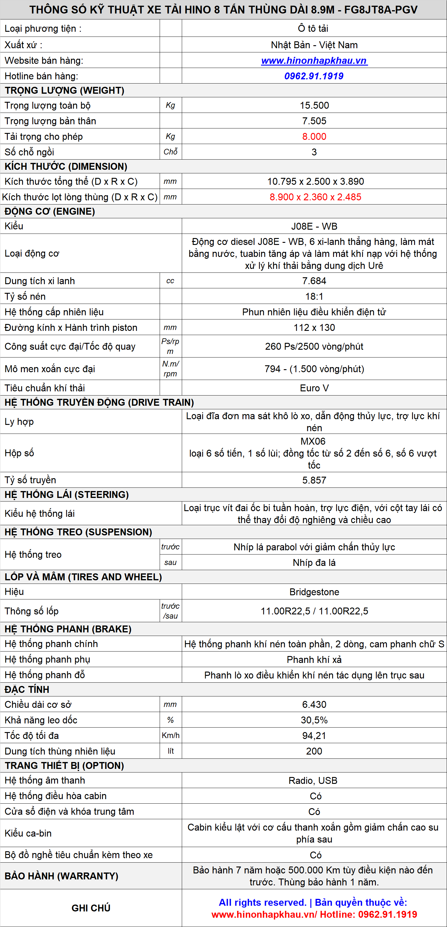 * THÔNG SỐ KỸ THUẬT XE TẢI HINO 500 TẢI TRỌNG 8 TẤN - MODEL FG8JT8A EURO 5: