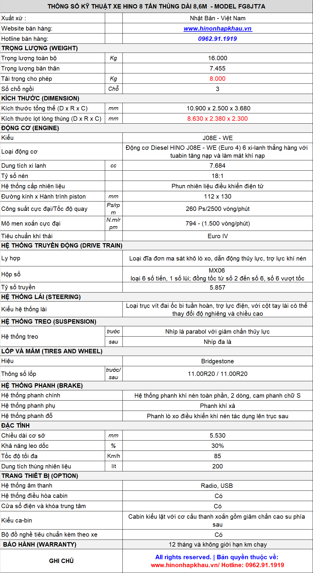 Với thương hiệu và chất lượng đã được khẳng định trên thị trường Việt Nam cũng như trên toàn thế giới, cùng với dịch vụ chăm sóc hậu mãi sau bán hàng, dịch vụ bảo dưỡng, chăm sóc uy tín chất lượng cao. ''Xe tải HINO 8t thùng kín FG8JT7A'' luôn luôn là " Sự lựa chọn hoàn hảo " cho tất cả mọi Khách hàng.