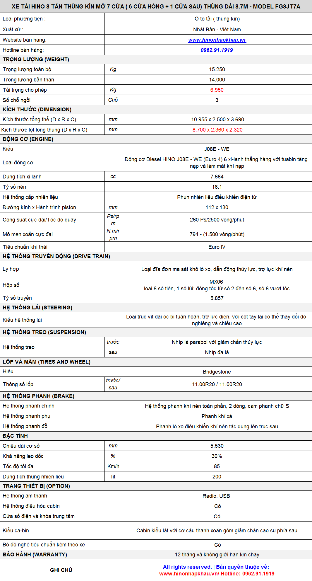 * THÔNG SỐ KỸ THUẬT XE TẢI HINO 8 TẤN THÙNG KÍN 7 CỬA ( MỞ 6 CỬA HÔNG MỖI BÊN HÔNG 3 CỬA VÀ 1 CỬA SAU) :