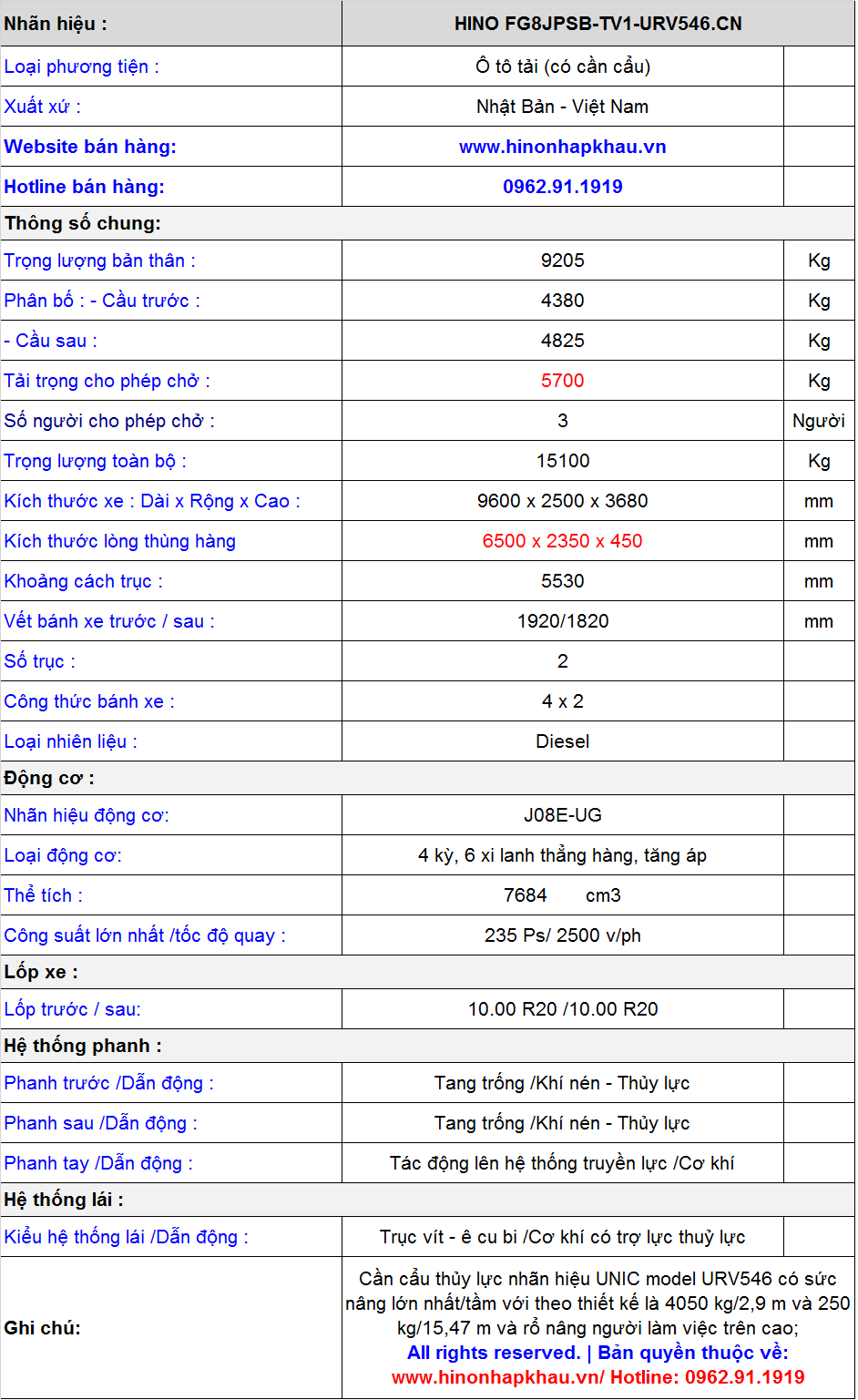 * THÔNG SÔ KỸ THUẬT XE TẢI CẨU NÂNG NGƯỜI HINO 9.4 TẤN FG8JP8A EURO 5 GẮN CẨU UNIC 4 TẤN UR-V546: