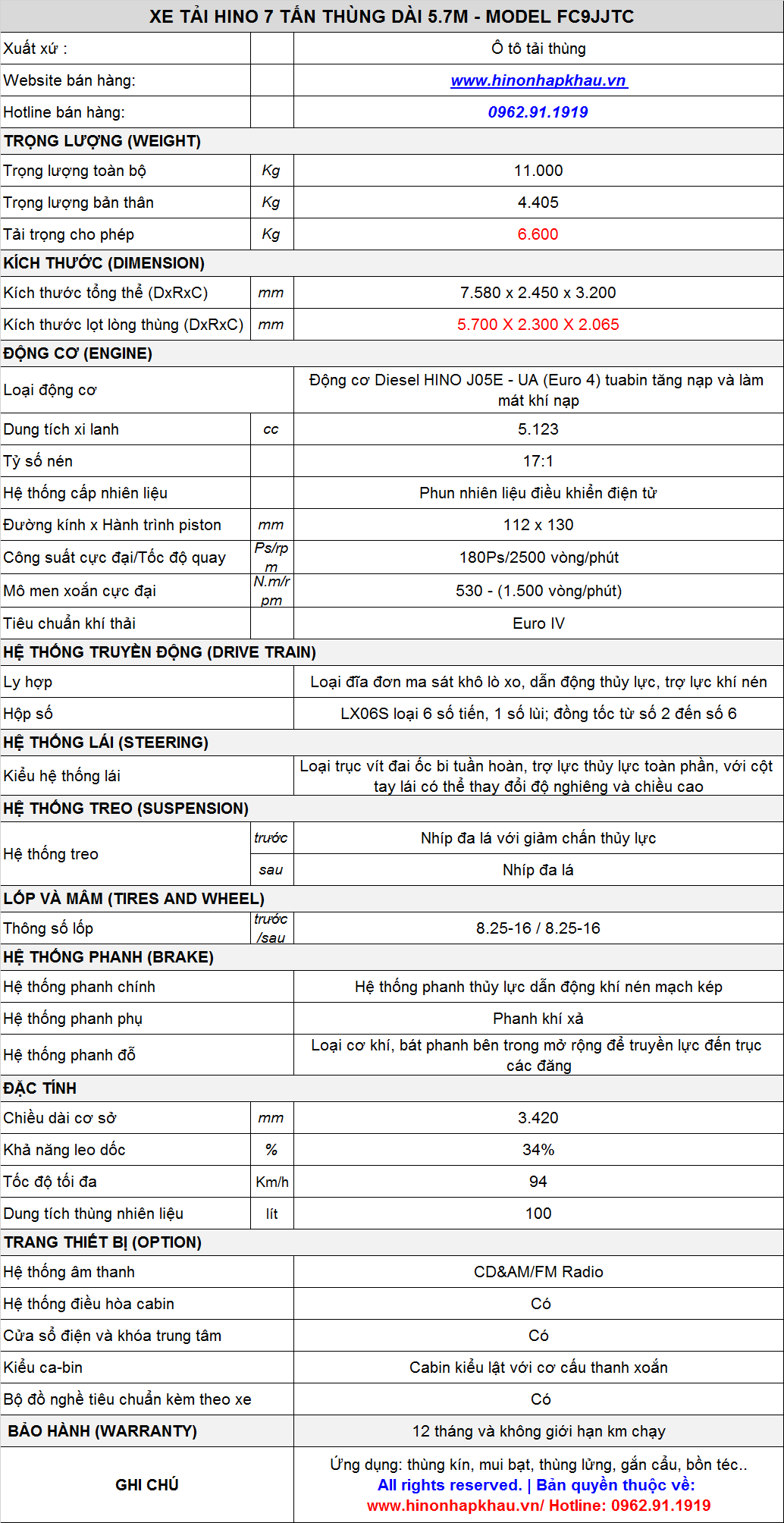 - Xe tải Hino trọng lượng toàn bộ 11 tấn thùng trung 5.7m - Model FC9JJTC