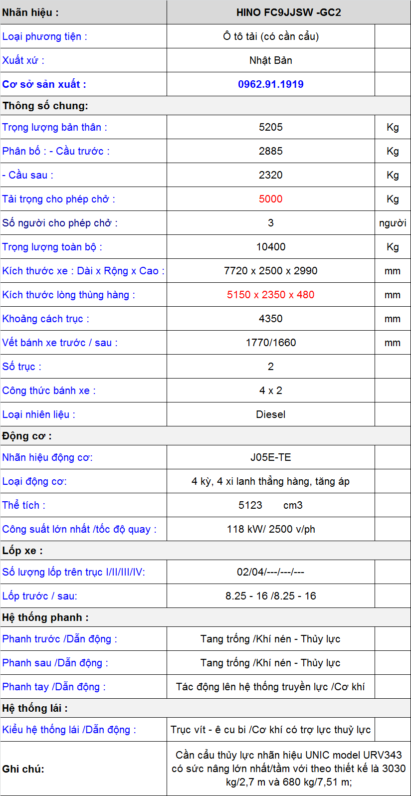 * Thông số kỹ thuật xe tải Hino FC gắn cẩu 3 tấn Unic URV343:
