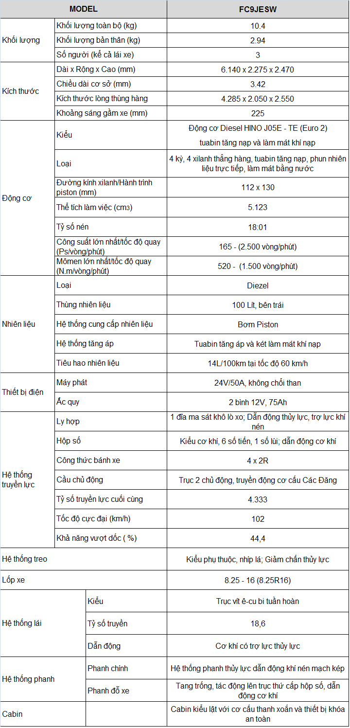 * Thông số kỹ thuật của Xe tải Hino 5,6 tấn: