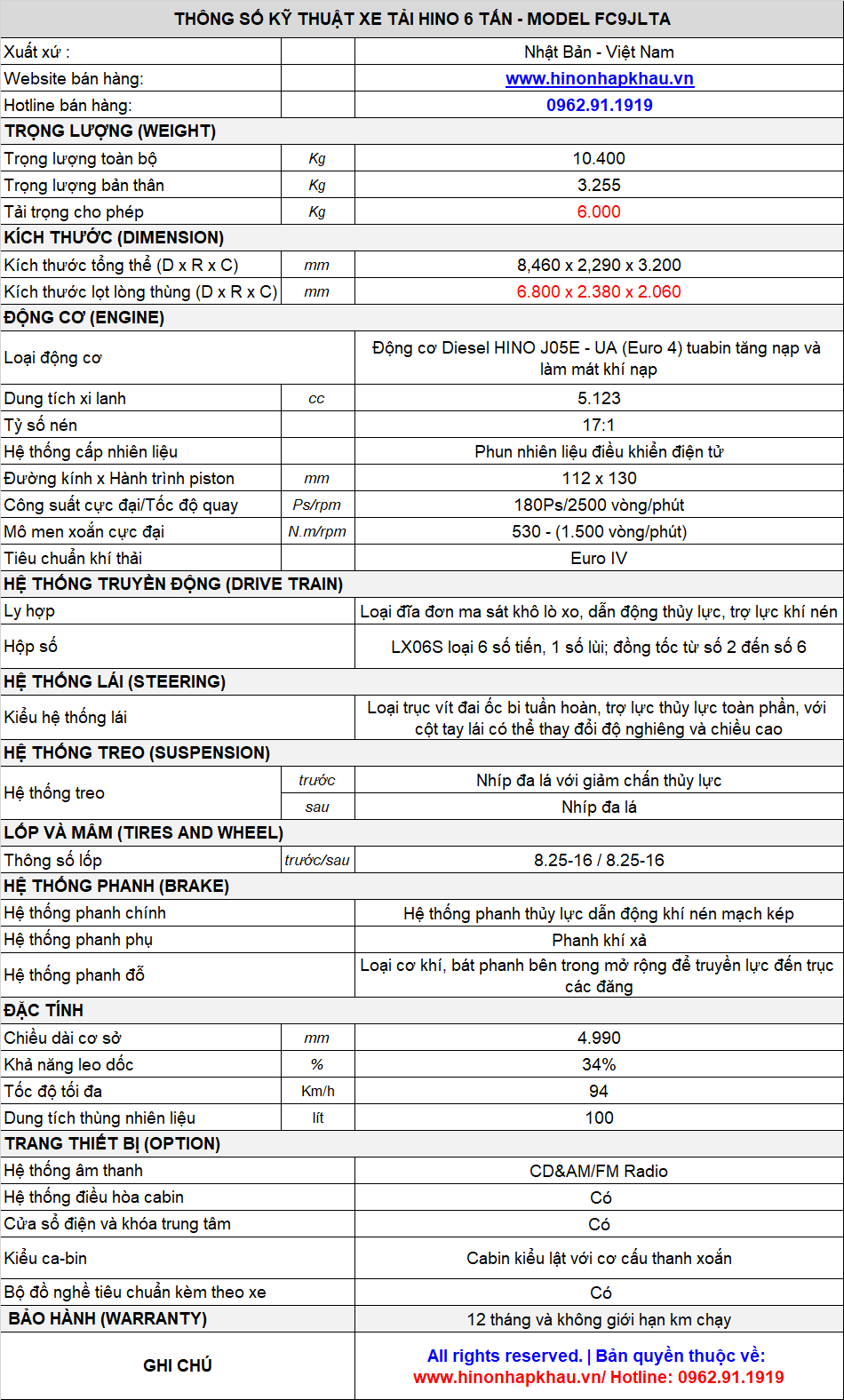 * THÔNG SỐ KỸ THUẬT XE TẢI HINO 6 TẤN: