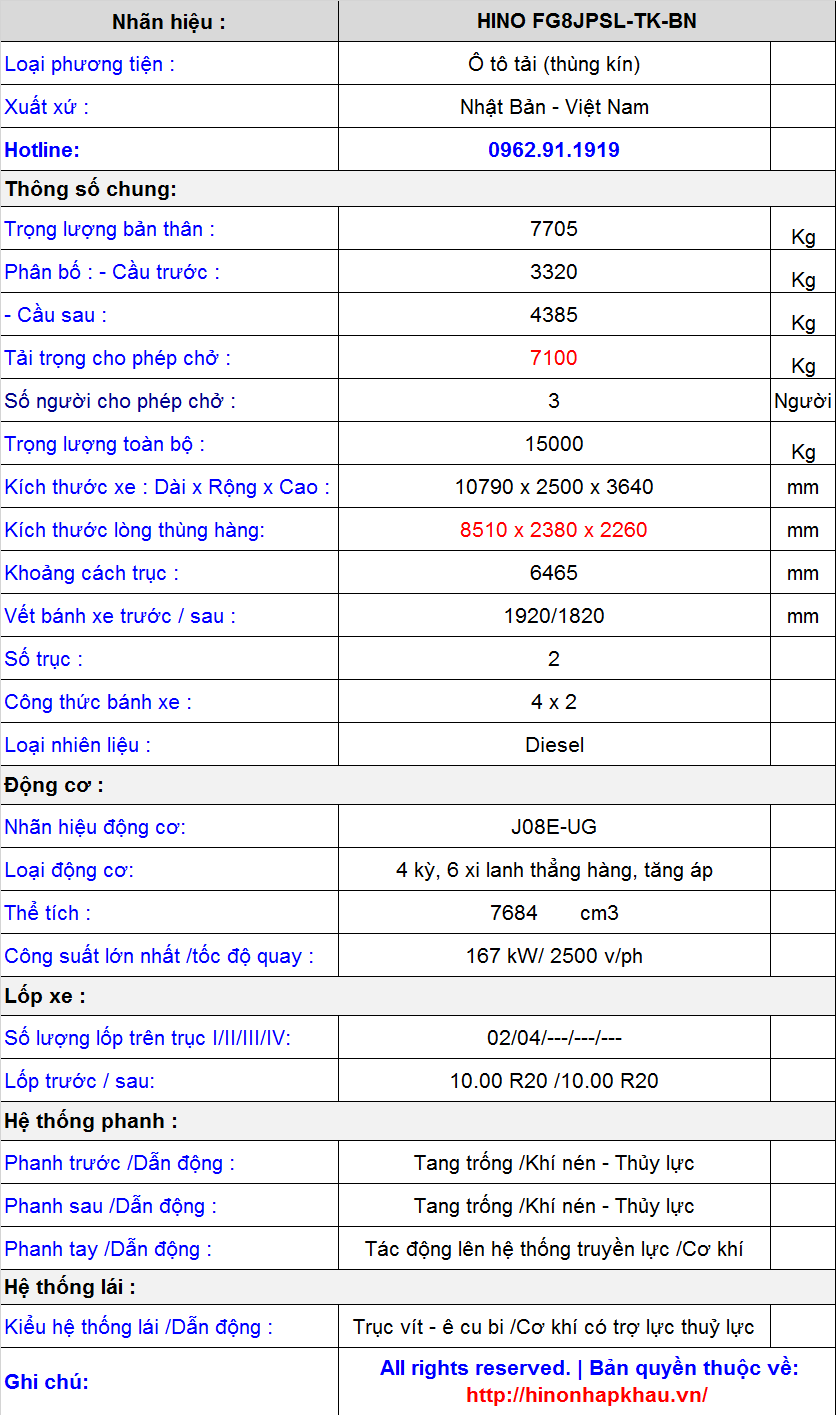 * Thông số kỹ thuật xe Hino 7,1 tấn thùng kín bửng nâng hạ hàng: