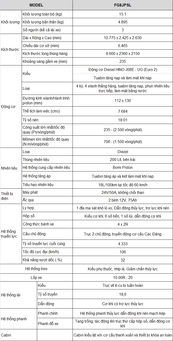 Thông số kỹ thuật của xe tải Hino 8 tấn:
