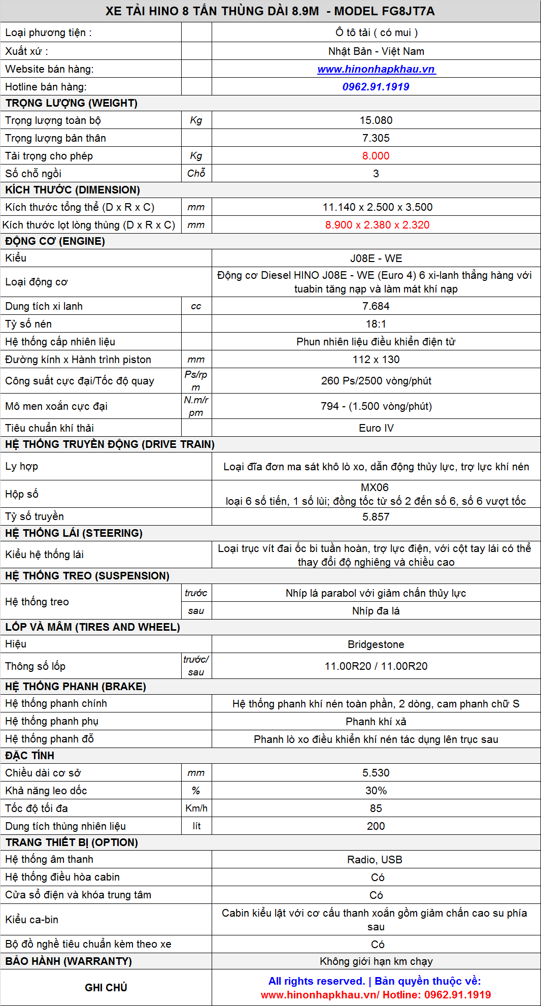 * THÔNG SỐ KỸ THUẬT XE TẢI HINO 500 SERIES FG8JT7A :