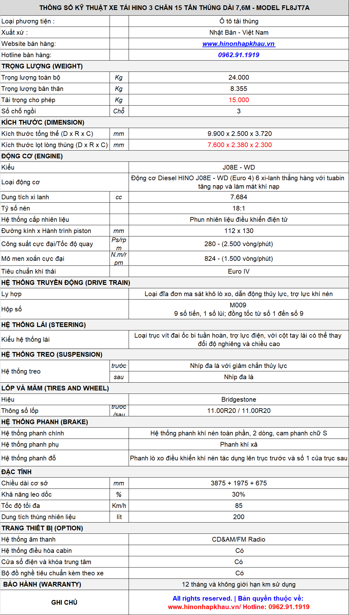 * Dòng sản phẩm HINO 15 TẤN MODEL FL8JT7A được bảo hành chính hãng 12 tháng không giới hạn số km sử dụng và được ưu đãi 4 lần bảo dưỡng miễn phí: thay dầu, thay lọc, nhớt, công... tại tất cả các đại lý ủy quyền của Hino Motors trên toàn quốc.