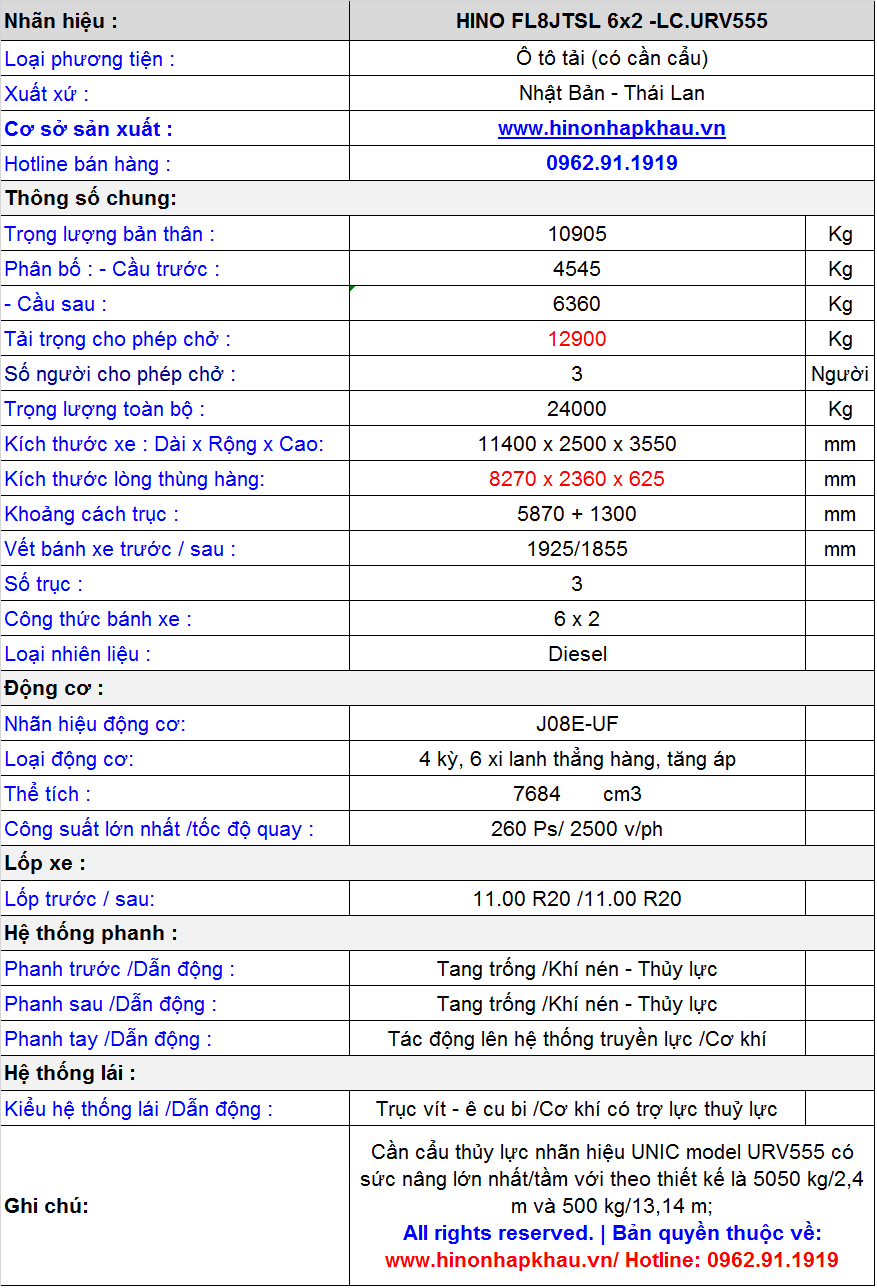* Thông số kỹ thuật xe tải Hino FL8JTSL gắn cẩu 5 tấn UNIC URV555 :