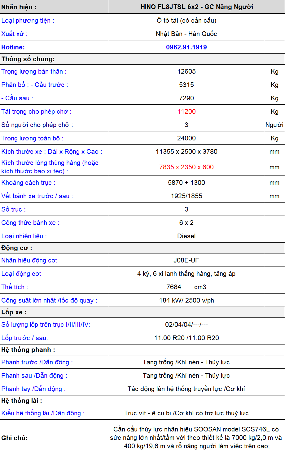 * Thông số kỹ thuật xe tải Hino gắn cẩu có rỏ nâng người làm việc trên cao: